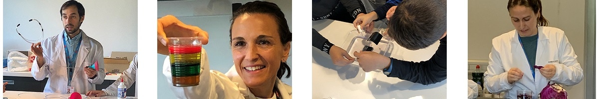 Para contribuir a desarrollar la curiosidad por entender lo que nos rodea y mostrarles que la ciencia es apasionante, hemos desarrollado 4 talleres distintos donde, de una forma divertida, los alumnos han aprendido distintos principios científicos haciendo sus propios experimentos. Algunos de ellos estaban relacionados con los colores (la explicación de por qué los líquidos no se mezclan y eso hace que podamos crear nuestro propio arco-iris), la música (han creado un altavoz y un estetoscopio), la luz (con un holograma) y otros divertidos juegos científicos.