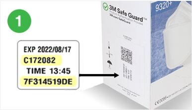 A un lado de la caja, debajo del logo 3M Safe Guard™, justo bajo el código de barras, verá un código de seguridad de 10 dígitos y un código de lote de 6 dígitos. Ambos códigos deben ser introducidos en los campos correspondientes de la web de validación.